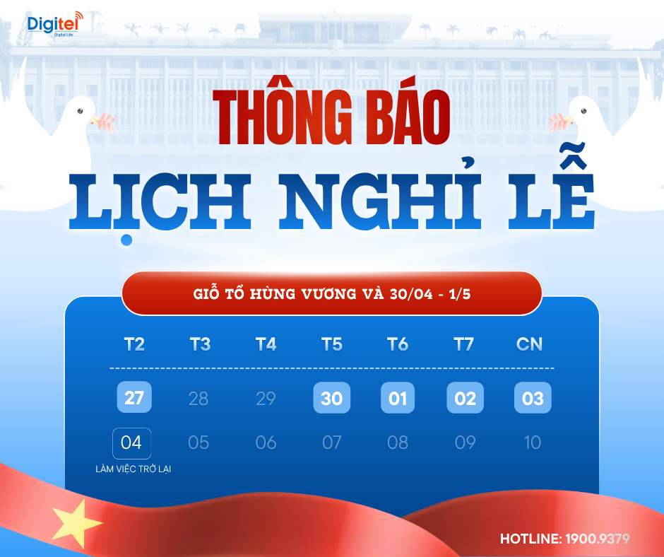 Nhân dịp Giỗ Tổ Hùng Vương (10/03 âm lịch) và Ngày Giải phóng miền Nam (30/4), Ngày Quốc tế Lao động (01/5), công ty Cổ phần Hạ tầng Viễn thông Số (Digitel) xin trân trọng thông báo lịch nghỉ Lễ như sau:
